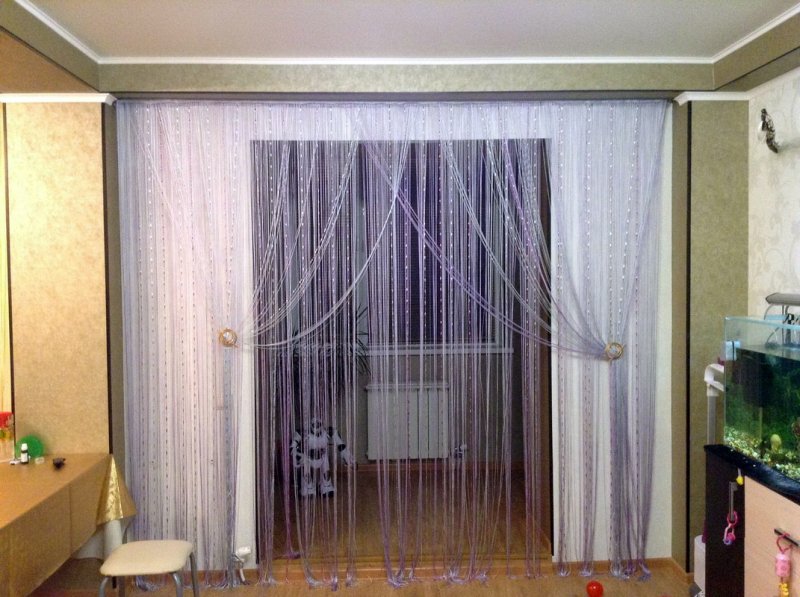 Подобные занавески будут более удобны, если размещать их только по краям. Можно по центру повесить короткие нити, которые не будут затруднять передвижение.