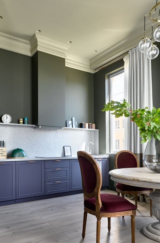 Это уже третий проект дизайнера Арианы Ахмад для одной семьи: ею были оформлены квартиры для дочки и матери. Теперь предстояло создать комфортное, интересное и практичное пространство для их любимой бабушки. Благодаря пяти большим окнам и высоким потолкам в квартире много дневного света и воздуха. Это позволило дизайнеру смело использовать в интерьере темный цвет. По просьбе заказчицы, планировка осталась стандартной без лишних экспериментов: кухня, столовая и гостиная объединены, а спальня расположена отдельно.