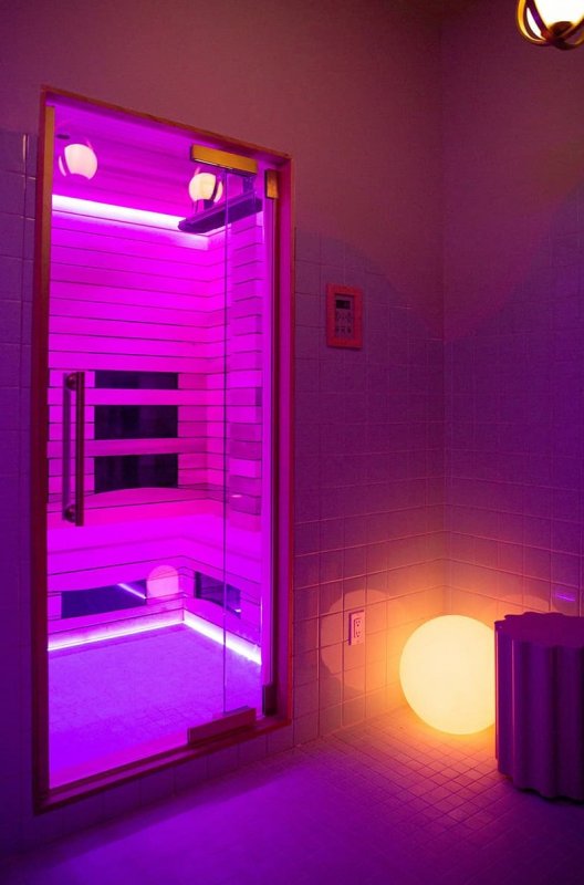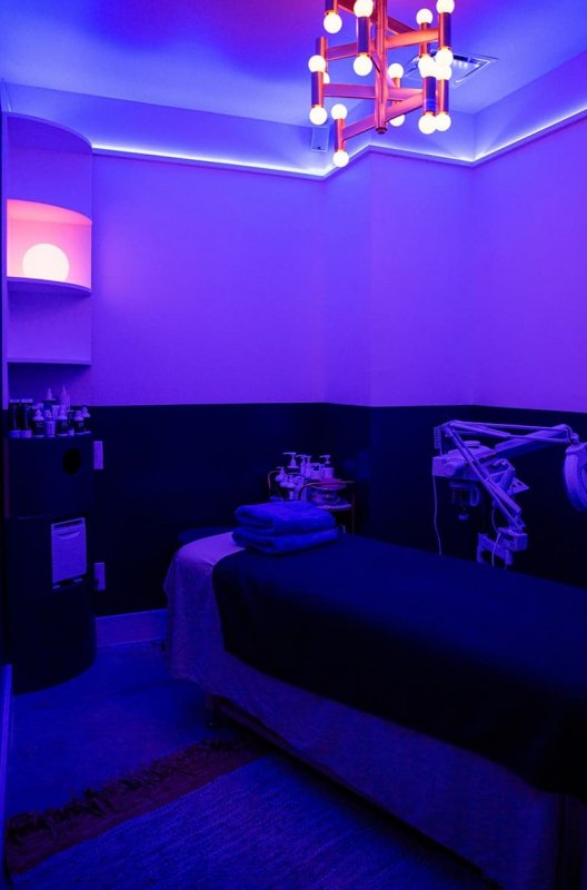 Комнаты отличаются разной высотой потолка, масштабами и внутренней эстетикой. Пастельные оттенки, отделка из натурального дерева, мебель без углов и полукруглые арки помогают создать мягкую расслабленную атмосферу. В глубине салона спрятан спа-центр с инфракрасной сауной, душем и раздевалкой. Персональная сауна имеет атмосферное всестороннее освещение – свет одновременно исходит сверху и снизу. Каждая массажная комната подсвечена своим цветом, напоминая о разных слоях ауры человека.