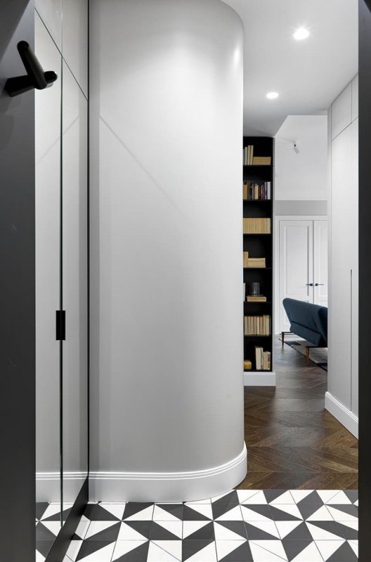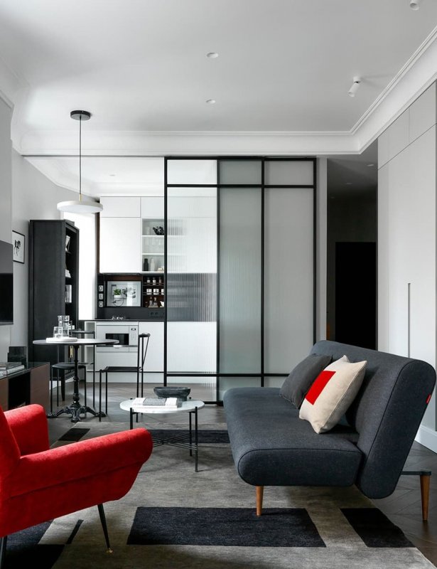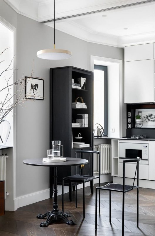 В историческом доме центра Москвы дизайн-студия «Однушечка» завершила проект квартиры с использованием элементов скандинавского и классического стилей. Ее владельцы – молодая пара, у которой было три ключевых пожелания: большая гостиная, скрытая приватная зона и вместительная система хранения. Полноценной кухни не требовалось, и дизайнеры выделили для нее скромный, но светлый уголок. Его при необходимости можно закрыть тонкой стеклянной перегородкой.
