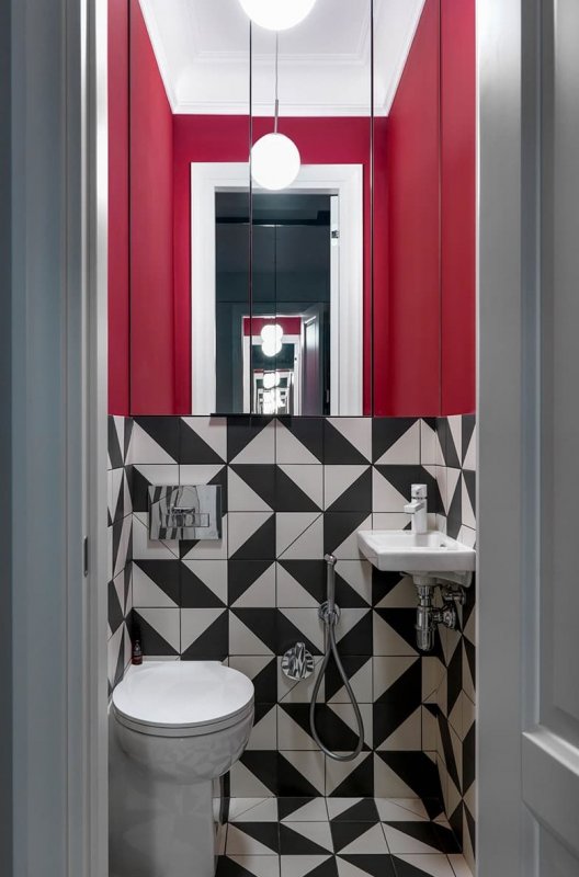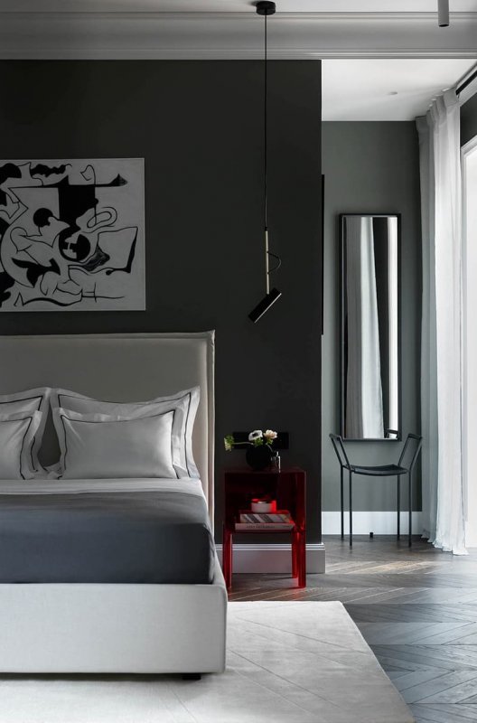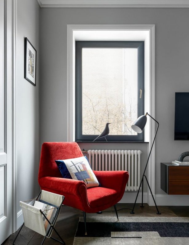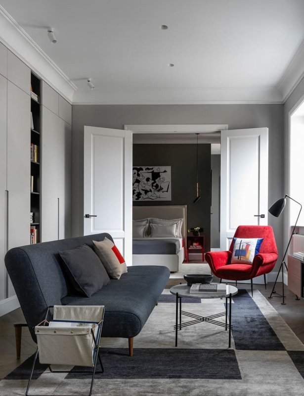 Три узких окна в гостиной вместо штор оформили классическими белыми наличниками, которые хорошо сочетаются с лепными карнизами, высокими плинтусами и паркетом «елочкой». Скандинавия проявилась в черно-белой гамме, дизайне мебели и лаконичных аксессуарах. Одну стену полностью занимает просторный шкаф с тремя отделениями для одежды и книг. По цвету фасадов шкаф совпадает со стенами, что делает его практически незаметным. По просьбе заказчиков, спальня выполнена в насыщенных темных тонах. С ними контрастируют белая кровать и красные тумбы Kartell. За изголовьем спрятана гардеробная.