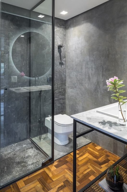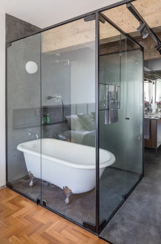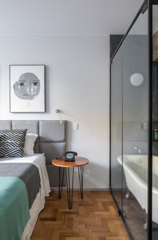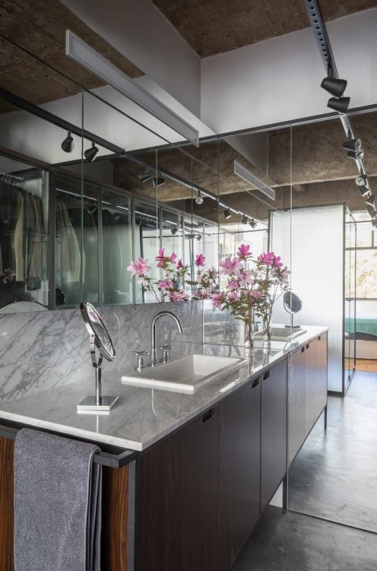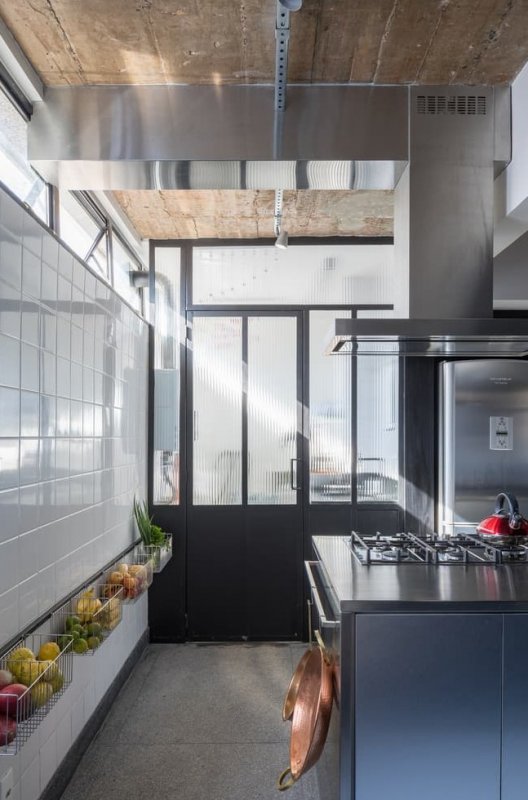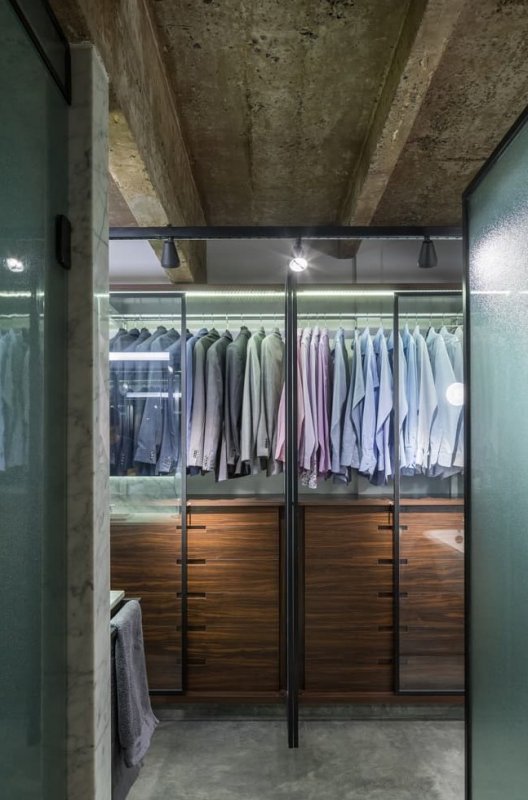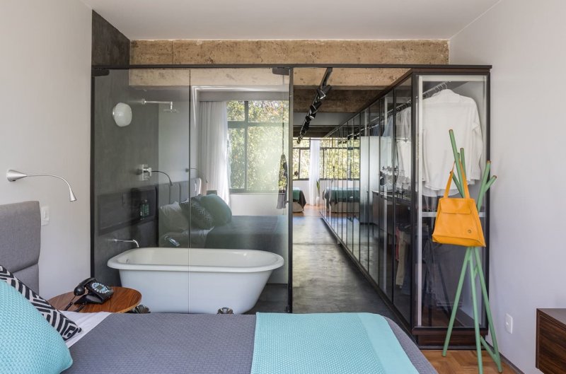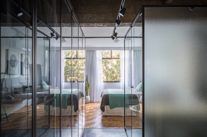 Третья спальня через раздвижную дверь тоже выходит в гостиную и на кухню. Прозрачный книжный шкаф помогает визуально объединить комнаты и усилить связь между всеми действиями в жилой зоне. Оригинальный деревянный пол, сырые натуральные материалы и открытая бетонная плита вносят элементы эстетики брутализма. Современная мебель и предметы 60-х годов в гостиной сочетаются с яркими деталями на фоне серого однотонного бетона. Кухня выполнена в индустриальном стиле. Ванная комната и гардероб с прозрачными стеклянными стенами полностью интегрированы в спальню.