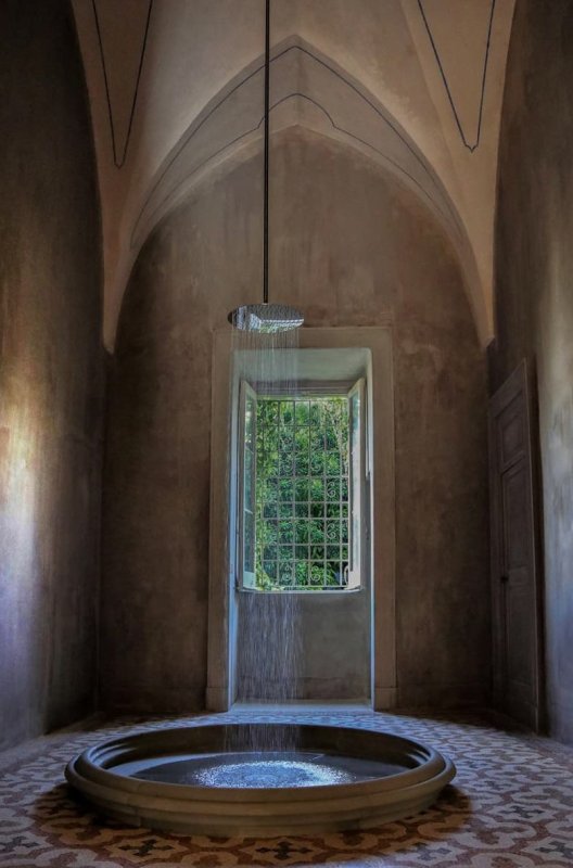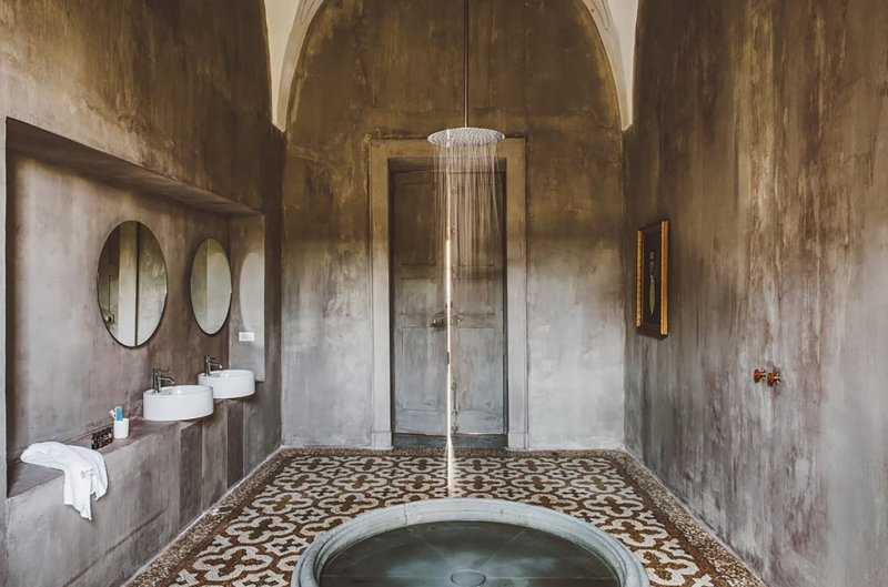 Дизайнеры использовали минималистичный подход к отделке интерьеров. Каждую комнату они украсили отдельным произведением искусства. Современная мебель строгих форм подчеркивает красоту аристократической истории. Изюминка ванной в Royal Junior Suite – эффектная инсталляция с шестиметровым потолочным душем и бассейном из песчаника, модного в эпоху Возрождения. В центре отеля – огромная остекленная кухня с лаконичным убранством. Здесь гости могут обсудить меню дня с шеф-поварами и пройти мастер-классы.