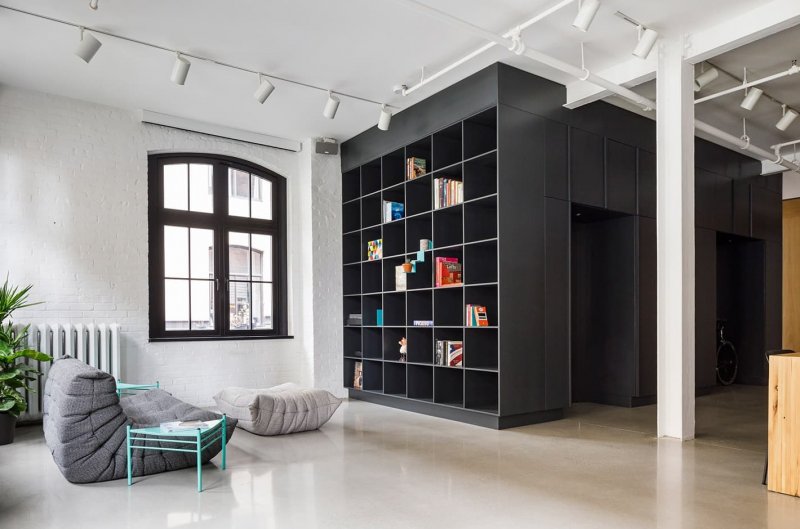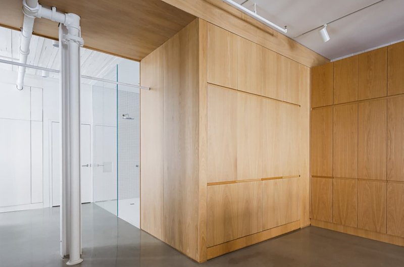 В квартиру можно попасть на старом грузовом лифте. Шкафы вокруг него, в том числе массивная книжная полка и складские помещения, оформлены черным цветом, контрастирующим с белыми кирпичными стенами и встроенными модулями из светлого дуба. Зонирование сделано с помощью деревянных шкафов, арок и полок, стеклянных перегородок и разных напольных покрытий. Это сохраняет изначальный простор помещения и наполняет его естественным светом. Особая изюминка проекта – огромная душевая на двоих с прозрачной стеклянной стеной между спальней. Не менее большая кухня оснащена длинным и широким деревянным островом. Текстура голых кирпичных стен сохранена, но белая краска придает им теплоты и уюта.
