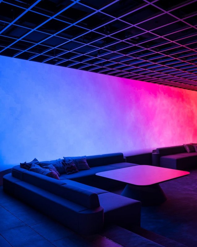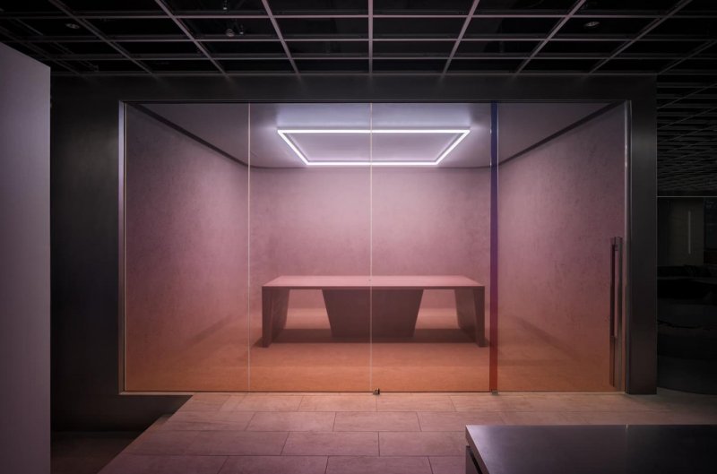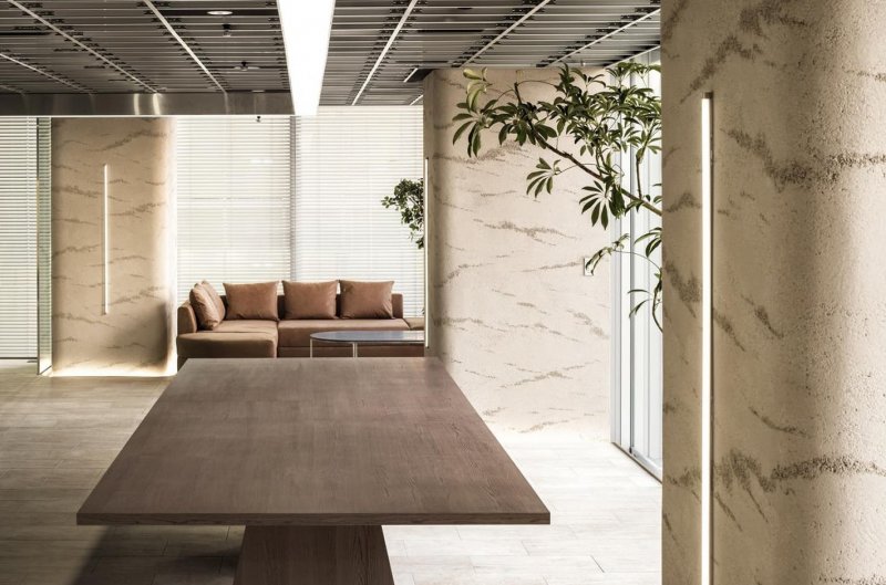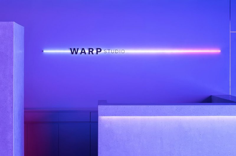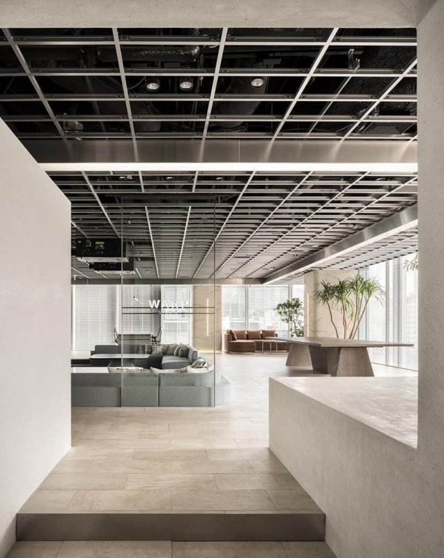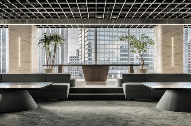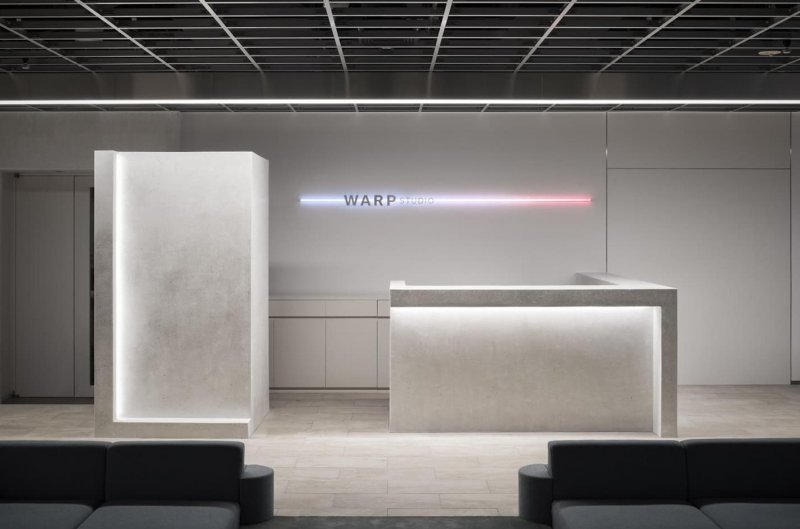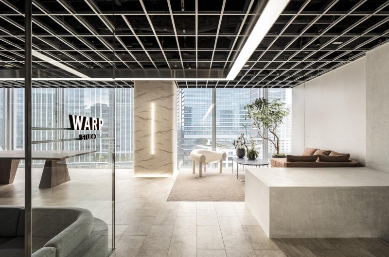 Mitsui Fudosan Co. решили сломать стереотип про типичный, безрадостный и мрачный, японский офис и применить принципиально другой подход для своего нового проекта Warp Studio — компании, которая занимается продажей недвижимости, как инновационных офисных зданий, так и экзотических курортов. Офис служит комфортной работе разных специалистов и позволяет командам с разными профилями и проектами работать совместно и одновременно, не мешая друг другу. Для решения этой задачи японское бюро I IN исключило из проекта многочисленные и привычные конференц-залы в пользу большой общей «гостиной» с глубоко посаженными диванами, низкими столиками, лаунж-зонами и интерактивной стеной. Пространство получилось одновременно очень технологичным (мощные проекторы, стеклянные стены в отдельных залах, цветная пленка, голографические светильники) и очень домашним (много растений, фактурная штукатурка на колоннах, огромное количество мягких зон и ковровых покрытий). При необходимости в таком офисе легко соблюдать социальную дистанцию, не выстраивая дополнительных перегородок.