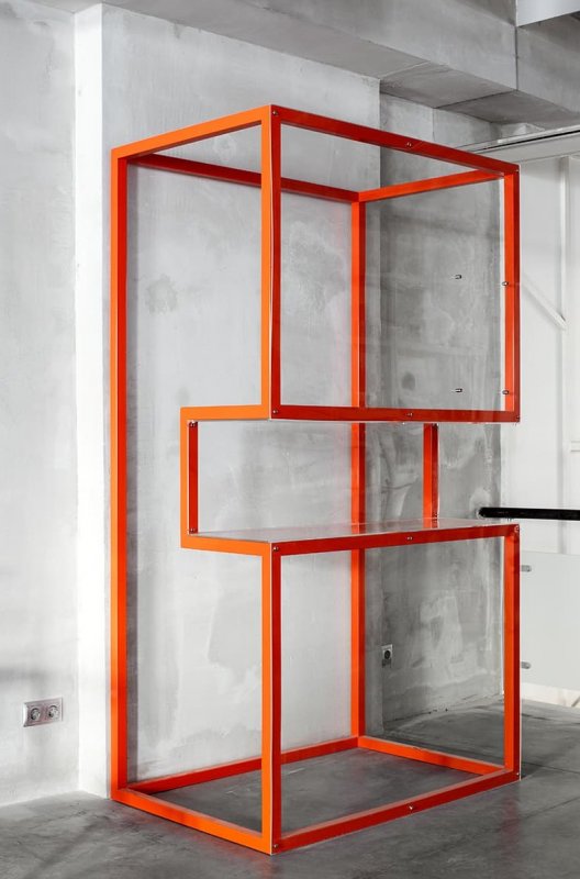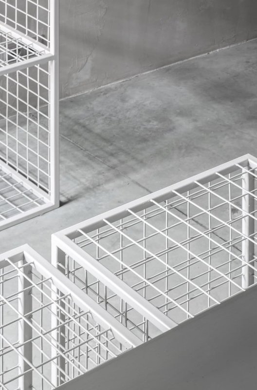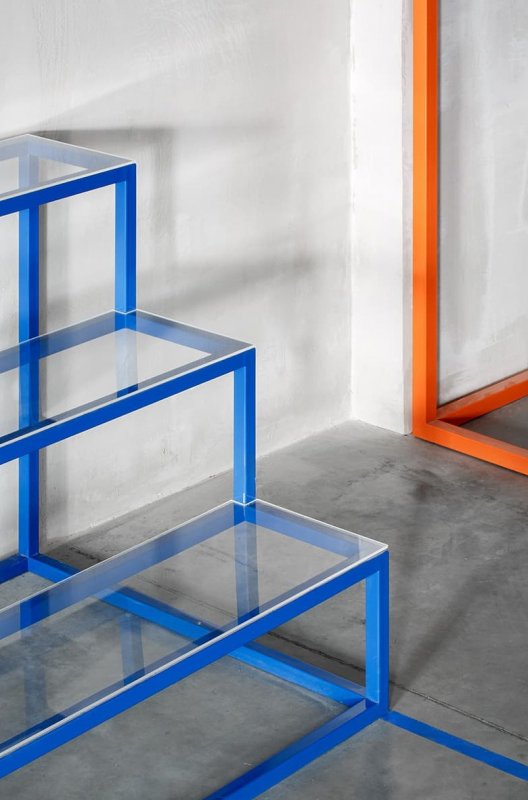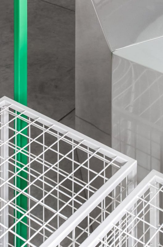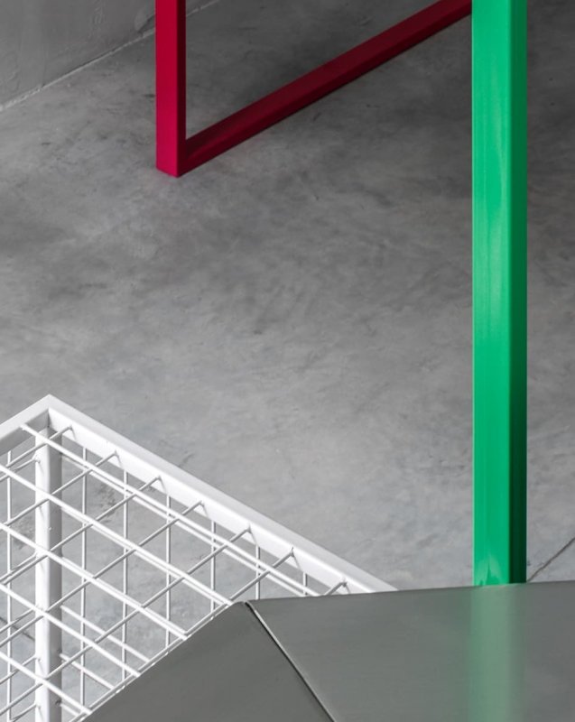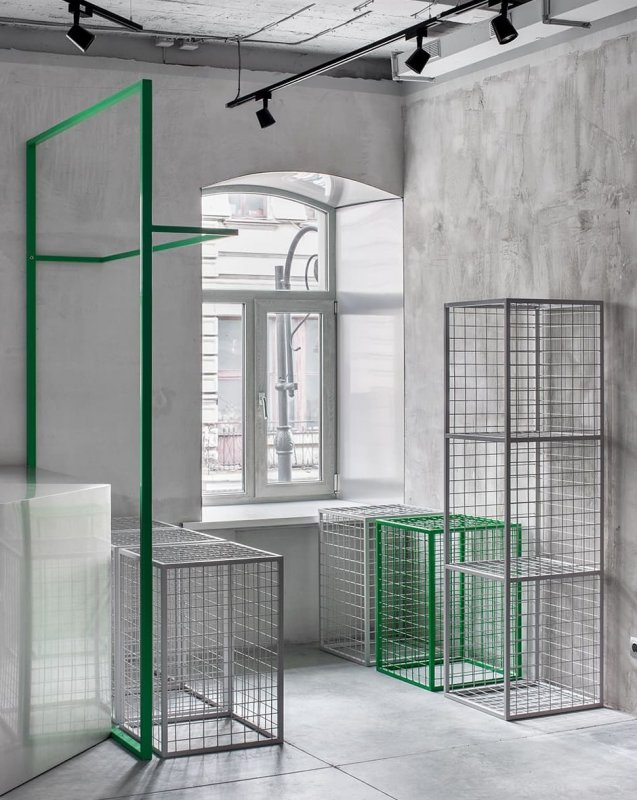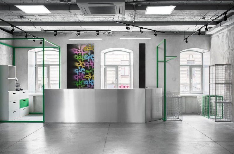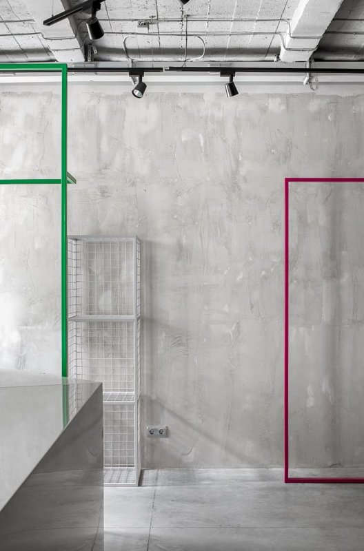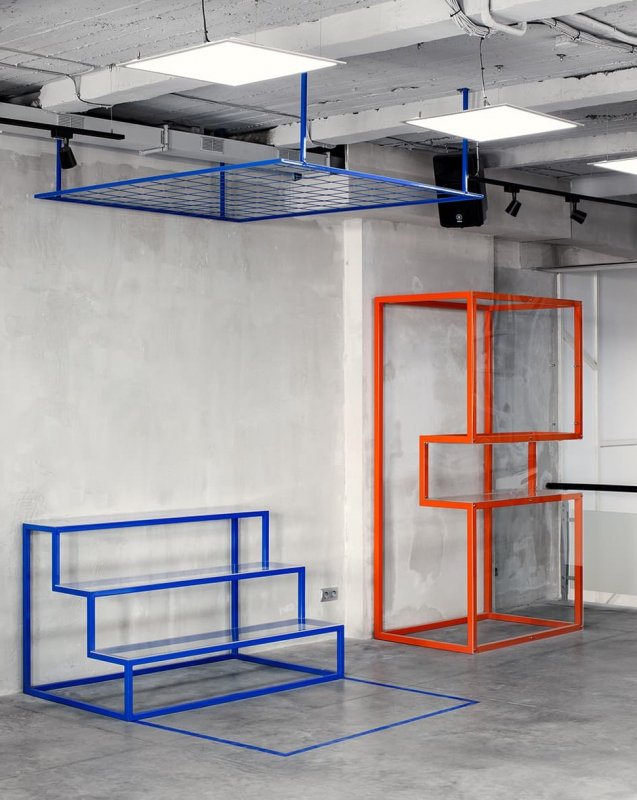 Проект был реализован с небольшим бюджетом и в сжатые сроки, что сильно способствовало быстрым решениям и быстрой реализации. Архитекторы предусмотрели важный нюанс, возможность обновлять и изменять пространство под презентации, лекции, мобильные выставки и мастер-классы. Поэтому по центру зала осталось много свободного места, а цветные выставочные стенды из металла разместились по периметру. Каждый из стендов был спроектирован специально для выбранных брендов, с учетом их запросов и продукции, чтобы подчеркнуть отличия друг от друга. В пустом помещении цветные конструкции забирают на себя все внимание и выглядят как арт-объекты на общем нейтральном фоне. В качестве основных материалов отделки использованы бетон, штукатурка и металл.