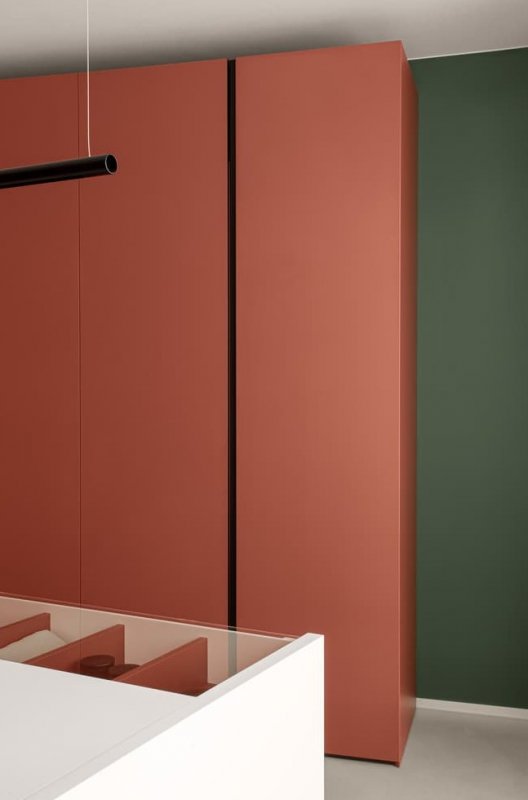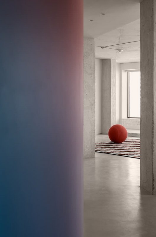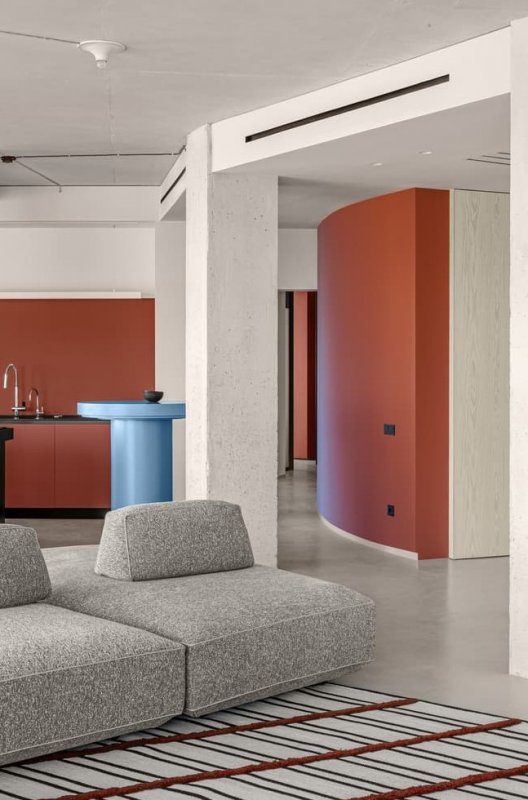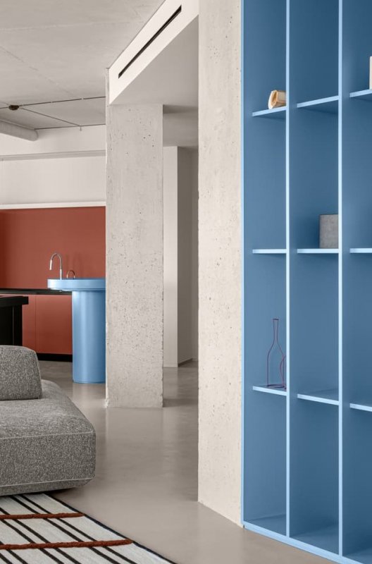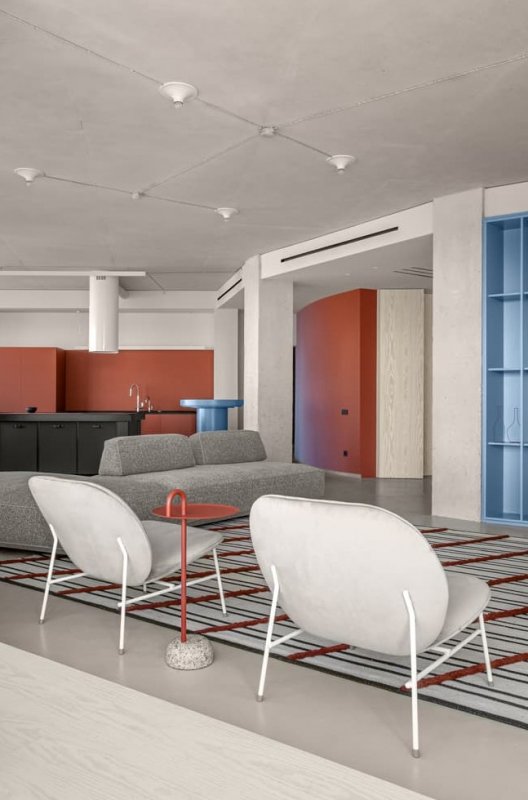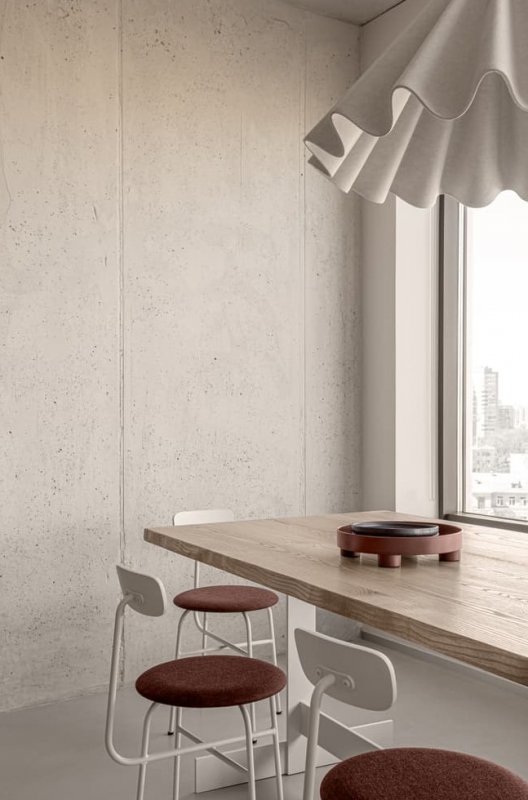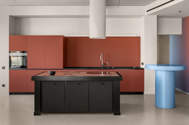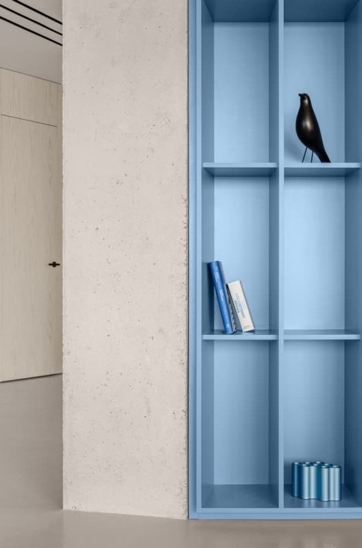 В основу концепции легли принципы минимализма – решено было спрятать все лишнее и разгрузить пространство, заменить стены на стеклянные перегородки и наполнить квартиру светом, переосмыслить планировку таким образом, чтобы появились разные сценарии движения. Гостиную, столовую, кухню и прихожую объединили в одну секцию. В соседней секции – расположили спальню с двумя входами: из основного коридора и столовой. Еще одну секцию отвели под гардеробную комнату с зоной макияжа у окна, двумя терракотовыми шкафами, островным комодом и витринным шкафом, выполненным по эскизам студии. Особое внимание в связи с профессией заказчицы уделили кухне. Большой остров задуман как место для встреч с друзьями и коллективного приготовления еды – его столешницу покрыли терракотовой плиткой. На основной кухне отказались от верхних шкафов, переместив хранение в нижние блоки. Архитекторы намеренно ушли от засилья кипенно-белого и покрасили стены в теплый бежевый оттенок. Цветовые акценты в пространстве расставляют терракотовая кухня, небесно-голубой обеденный стол и зеленый прикроватный столик. В отделке оттолкнулись от желания сохранить бетонные колонны и потолок – потолок покрыли лисеровочным полупрозрачным лаком, а пол микроцементом.