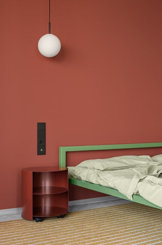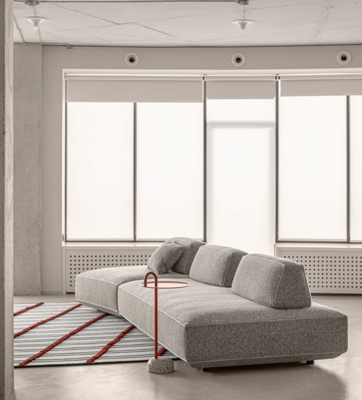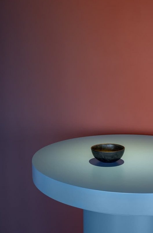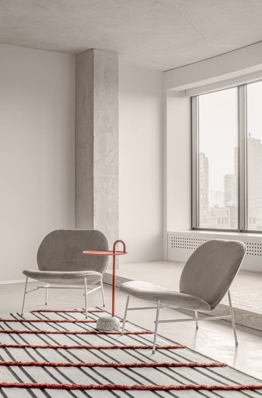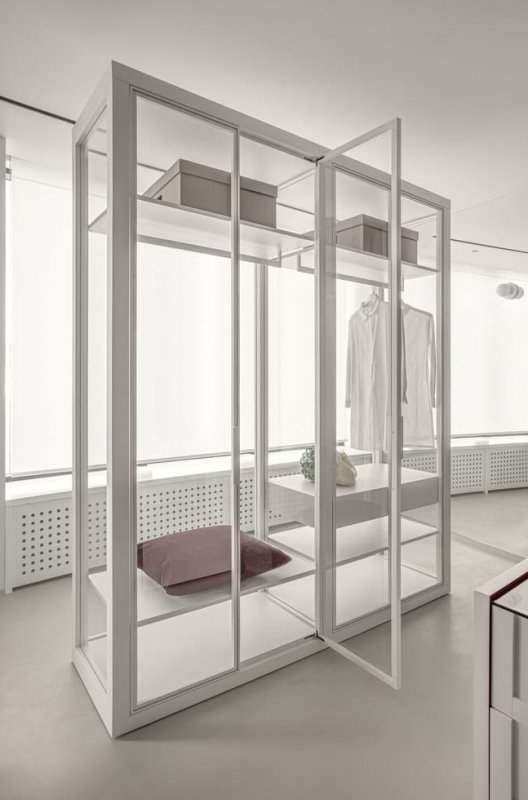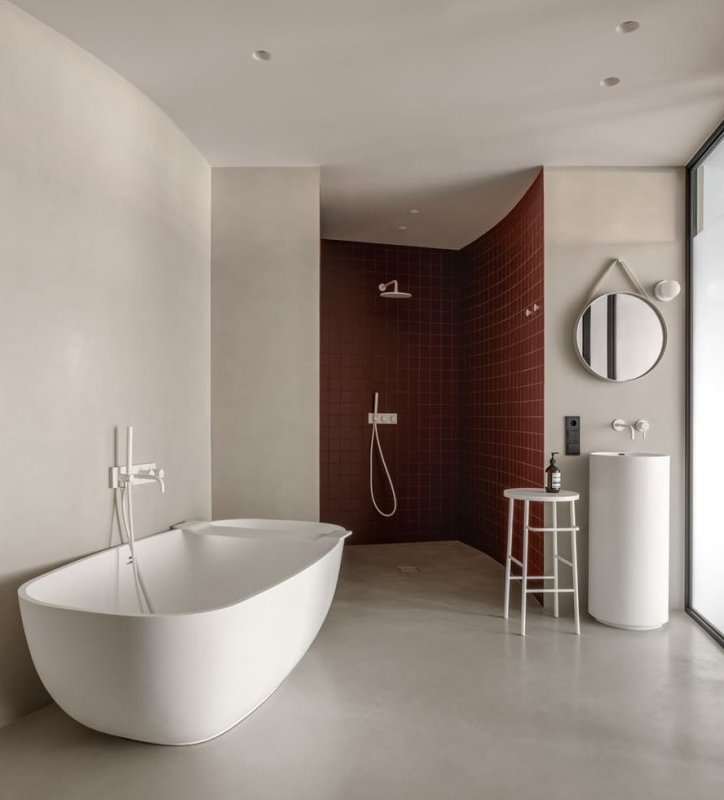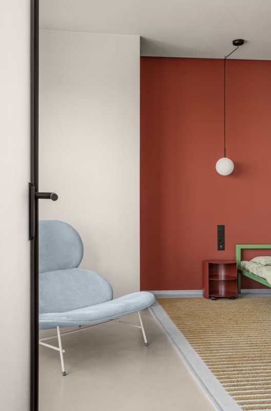 В основу концепции легли принципы минимализма – решено было спрятать все лишнее и разгрузить пространство, заменить стены на стеклянные перегородки и наполнить квартиру светом, переосмыслить планировку таким образом, чтобы появились разные сценарии движения. Гостиную, столовую, кухню и прихожую объединили в одну секцию. В соседней секции – расположили спальню с двумя входами: из основного коридора и столовой. Еще одну секцию отвели под гардеробную комнату с зоной макияжа у окна, двумя терракотовыми шкафами, островным комодом и витринным шкафом, выполненным по эскизам студии. Особое внимание в связи с профессией заказчицы уделили кухне. Большой остров задуман как место для встреч с друзьями и коллективного приготовления еды – его столешницу покрыли терракотовой плиткой. На основной кухне отказались от верхних шкафов, переместив хранение в нижние блоки. Архитекторы намеренно ушли от засилья кипенно-белого и покрасили стены в теплый бежевый оттенок. Цветовые акценты в пространстве расставляют терракотовая кухня, небесно-голубой обеденный стол и зеленый прикроватный столик. В отделке оттолкнулись от желания сохранить бетонные колонны и потолок – потолок покрыли лисеровочным полупрозрачным лаком, а пол микроцементом.