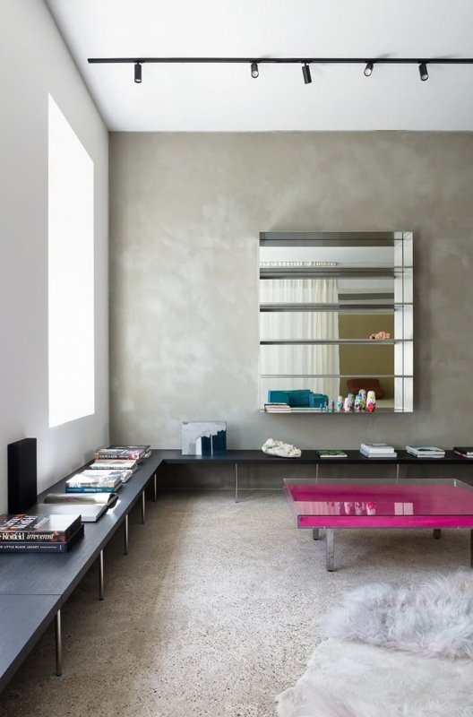 Общественным пространством квартиры характерна более нейтральная палитра: цемент с затиркой, белые и бежевые стены, кристально белый камин, кремовый ковролин в дневной зоне отдыха. В гостиной архитекторы спроектировали зеркальный стеллаж и низкий буфет из черного дерева, который установлен по периметру всей комнаты.