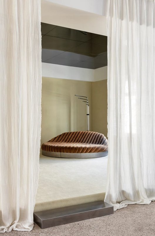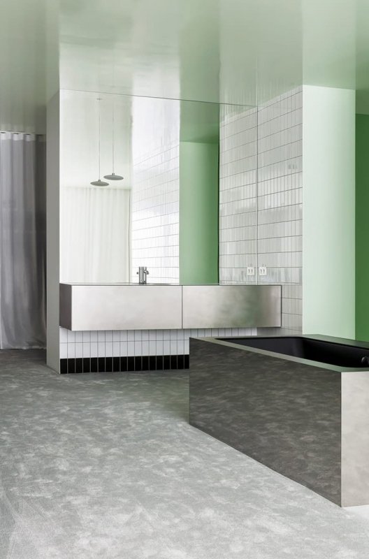 Бельгийская студия Atelier Dialect декорировала антверпенскую квартиру при помощи зеленых стен и стальной ванной по центру комнаты.