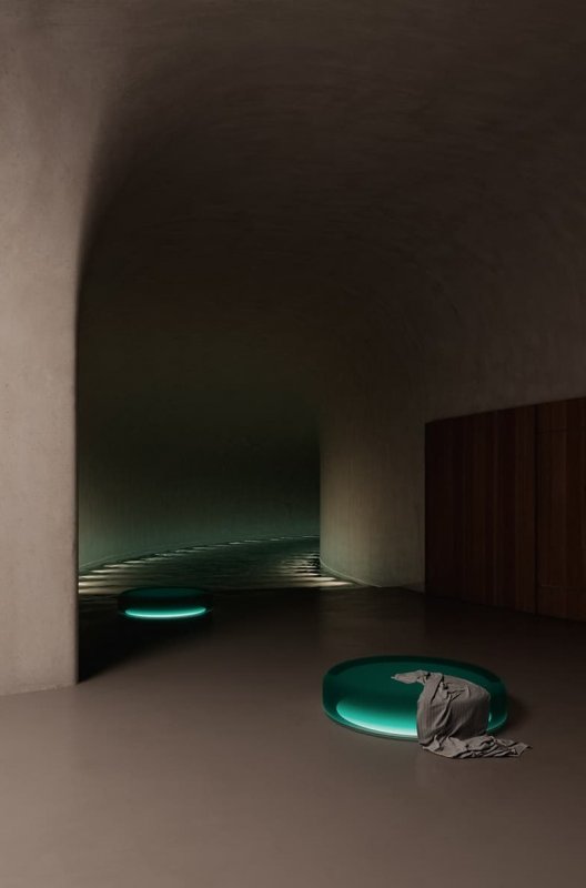 В центре цилиндрической комнаты для медитаций расположен мощный световой луч, благодаря которому можно менять сценарии на потолке. Это может быть звездное небо, может моросить дождь или восходить солнце.