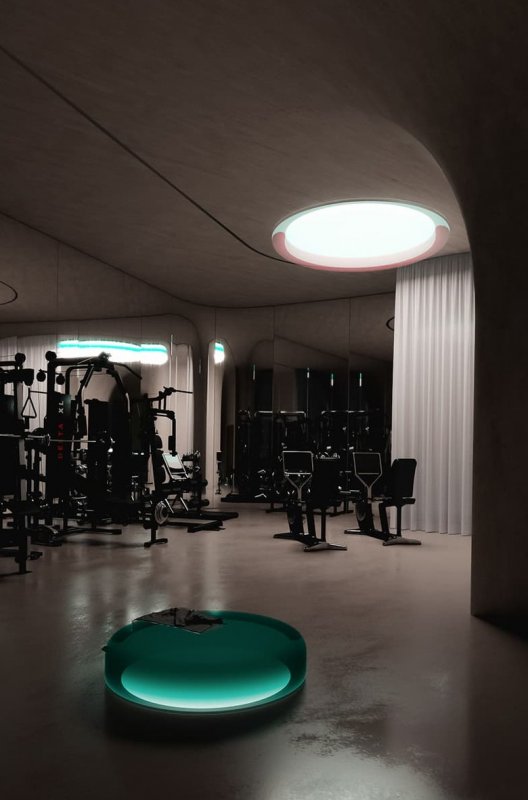 Благодаря таким решениям создаются различные сценарии: от медитативного дрейфа мысленным морем до хардкора во время работы над мышцами спины. И опять — закругленные пространства, их удвоение в зеркалах, перетекание стен в потолок — все ради того, чтобы создать ощущение легкости, бесконечности. «Мы стремились создать пространство, в котором хотелось бы жить, даже когда нет апокалипсиса. Природные материалы, максимально сохранены запахи, текстуры, волокна», — комментирует архитектор Марина Гречко.