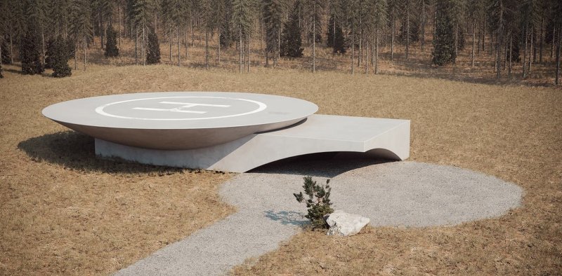 Массивная бетонная конструкция оснащена тремя входами-выходами и вертолетной площадкой на крыше. Она занимает 172 кв.м и может быть размещена или рядом с главным домом, или где-то в лесу (как в этом примере).