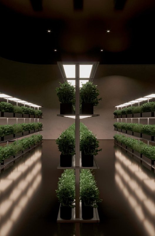 Начнем с того, что будет рыбоводный бассейн. В отдельной комнате — огород с фитооборудованием, где можно выращивать зелень, овощи и некоторые фрукты. Также на жилом этаже размещается большой складской запас продовольствия. В отдельной зоне сгруппировали помещения для персонала.