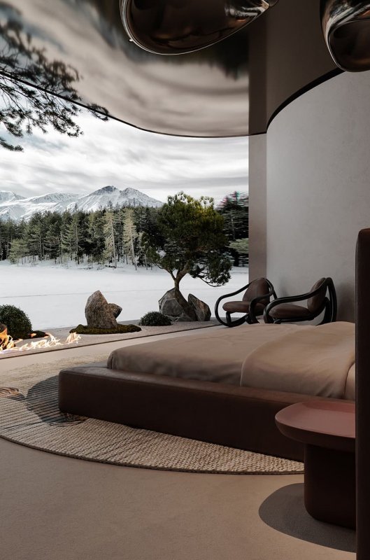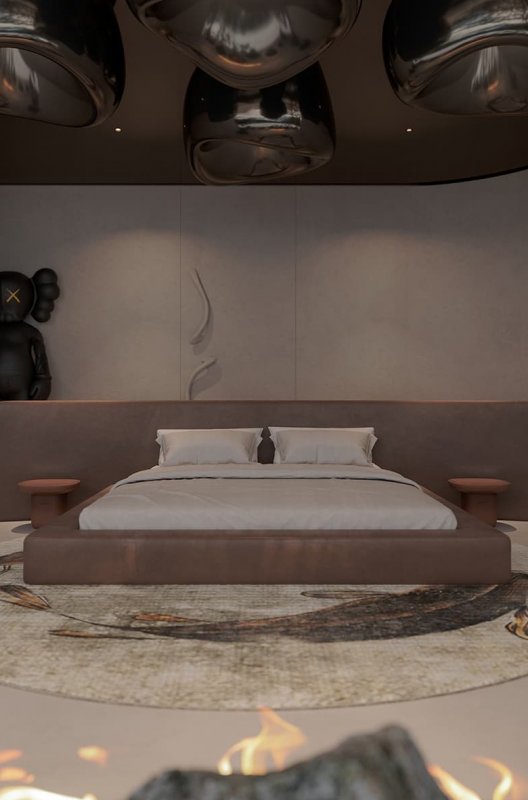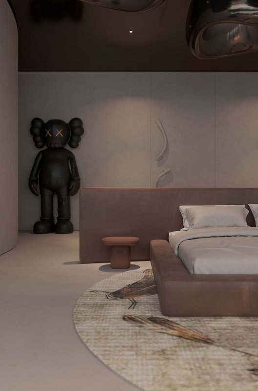 На первый взгляд эти апартаменты ничем не отличаются от наземных. Минималистичное и спокойное пространство, где на страже сна — Kaws, а над кроватью — авторские «облака» от Сергея Махно, которые никогда не проливаются дождем. Но если обратить внимание на архитектуру дизайна, замечаем отсутствие прямых углов — форма комнаты почти цилиндрическая. Такой прием в наземной архитектуре используется не часто, здесь он помогает создать иллюзию бесконечности, что стен и вовсе не существует.