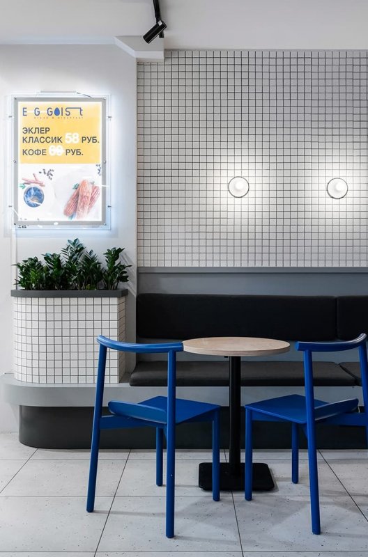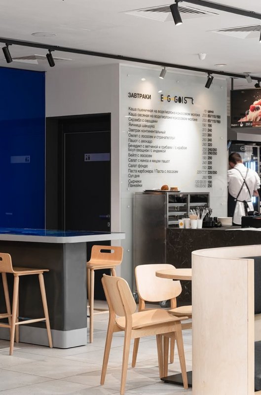 Интерьерное решение было задумано намеренно с определенной наглостью и смелостью, его подсказало название EGGOIST: отказ от традиционного уюта булочной в пользу лаконичного, сдержанного, почти аскетичного дизайна в отделке и деталях. Неожиданная цветовая гамма с единственным ярким акцентом становится фоном для главного элемента интерьера — витрин с аппетитным хлебом и пирожными. Чтобы гости, в традициях здорового эгоизма, не теряли много времени на покупку кофе и булочек, обстановка пекарни задумана как продолжение холла торгового комплекса, но с комфортной посадкой на 30 мест.