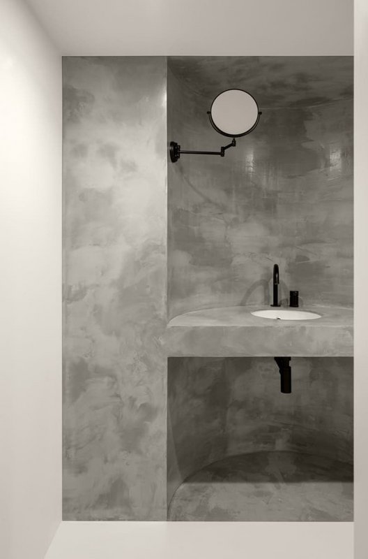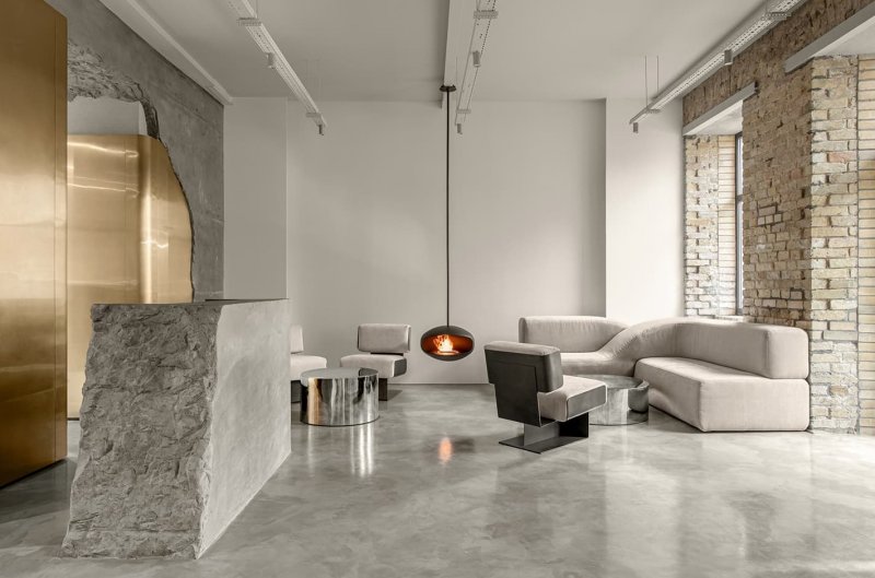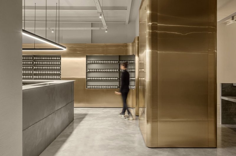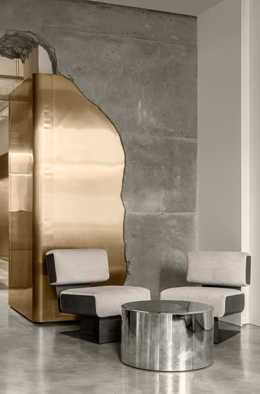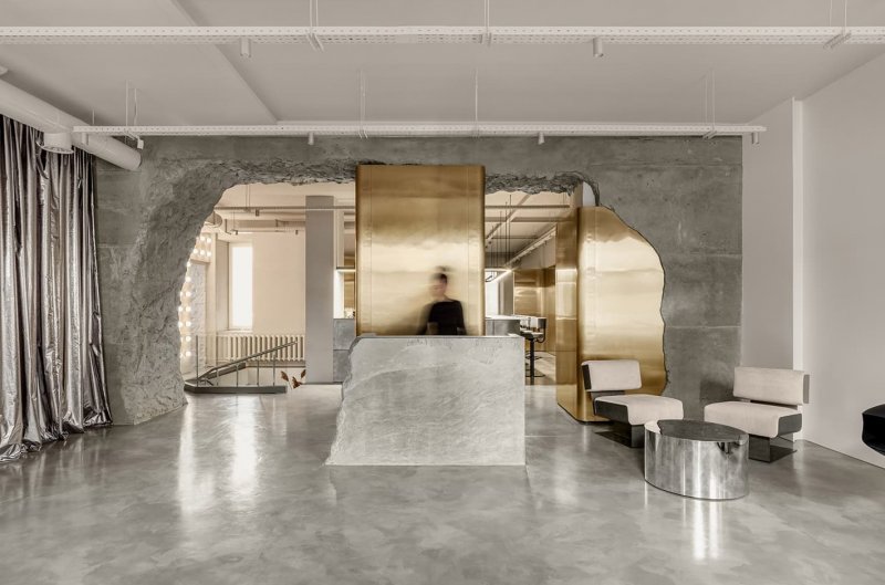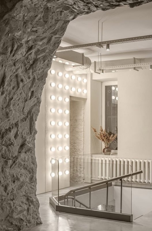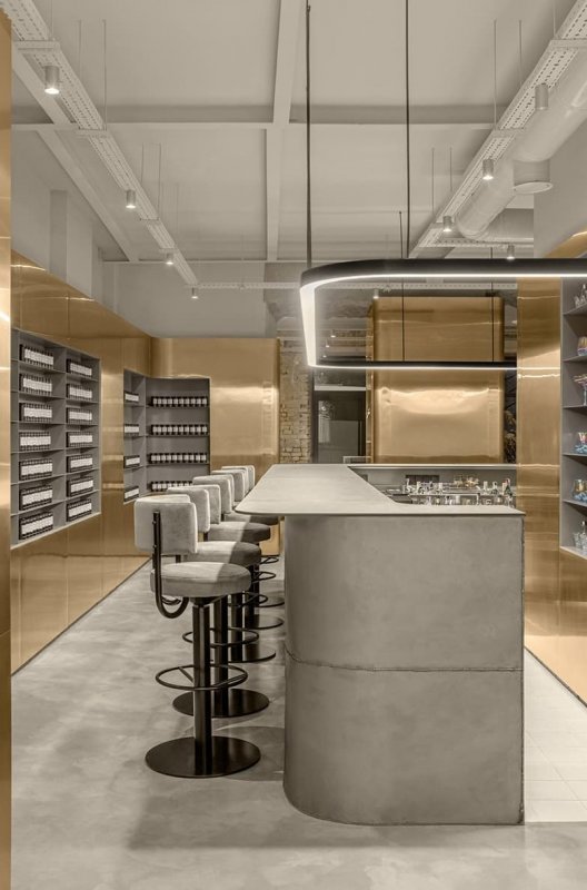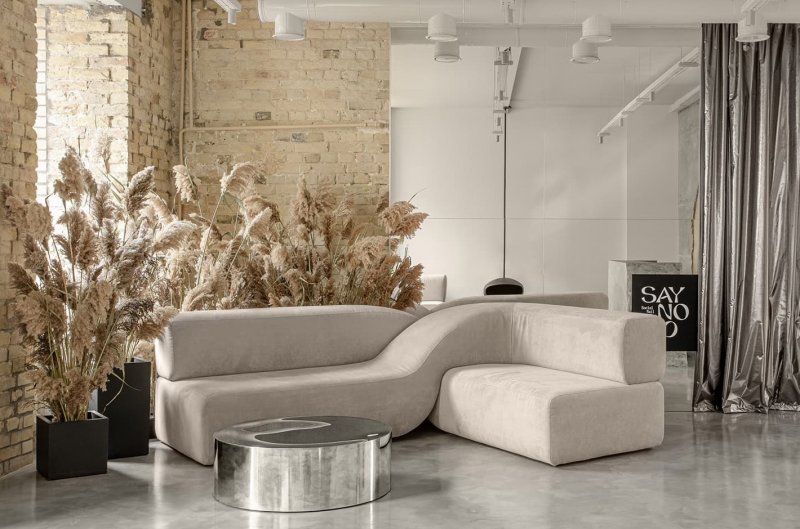 Двухуровневое помещение в историческом здании в Киеве может похвастаться 4-метровыми потолками, среди сложностей – своеобразная геометрия стен, среди них буквально не было ни одной параллельной. На первом этаже расположились зоны ресепшна, салона, маникюра и педикюра; на цокольном этаже – зона мейк-ап, уход за волосами и косметологии. Задача бюро состояла в том, чтобы сделать пространство нетипичным, поэтому процесс начался с исследования «штампов», характерных для салонов красоты по всему миру – архитекторы выделили наиболее общие элементы и решения, цвета и текстуры, и постарались избежать их в новом проекте. Поэтому все зоны для процедур вынесли на нижний этаж, либо спрятали в нишах, постарались подать их деликатно и не акцентировать на них внимание. Say No Mo – это, скорее, современная квартира или шоу-флэт для расслабленных вечеринок, с большим количеством лаунж-зон; ощущение процедурной здесь полностью отсутствует. Элементы салона красоты – например, педикюрные раковины – легко прячутся под специальными полыми столиками. Из важных акцентов – монолитная бетонная арка на входе (весом в несколько сотен килограммов), «золотая» раковина, которая была собрана из двух детских ванн советских времен, и закругленные панели из нержавеющей стали, окутывающие стены и колонны.
