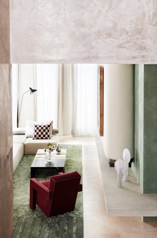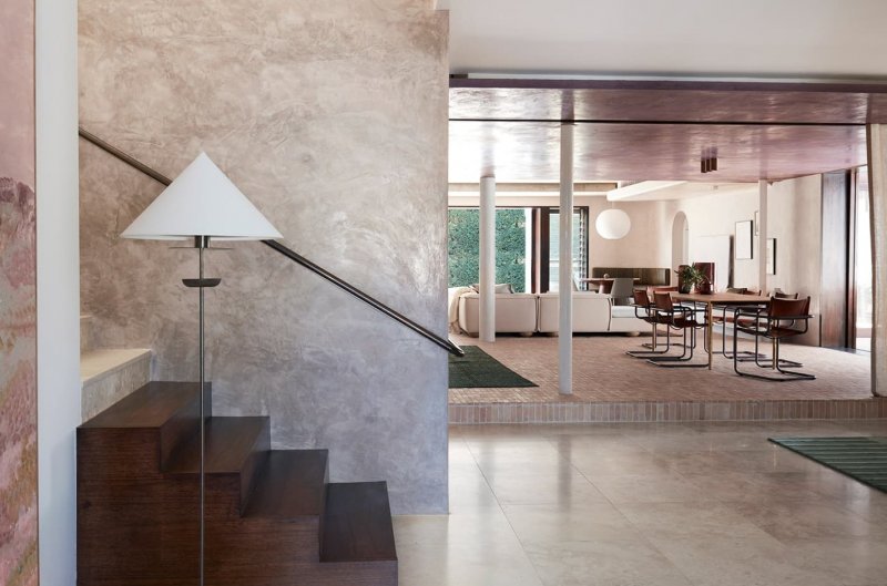 Первым делом YSG разрушили все возможные перегородки, чтобы сформировать открытое общественное пространство с гостиной, кухней и столовой. Основной задачей бюро было создание плавной, «текучей» атмосферы. Кроме того, важно было, чтобы пространство было ярким и полным природных контрастов, чтобы первый этаж стал продолжением внушительного сада за окном. Этой цели служит терракотовая плитка на полу, бесшовно интегрированная во всю нижнюю плоскость, как на террасе, так и внутри дома на первом этаже. Дискретным фоном для скульптурной мебели и харизматичного декора стала штукатурка Marmorino — дизайнеры осознанно ушли от стандартного белого в пользу насыщенных, тактильных, но нюдовых оттенков: баклажанового, цвета ириса и мягкого зеленого. Интерьер был отмечен Australian Interior Design Awards 2020, как один из лучших в категориях «Дизайн частного пространства» и «Декор частного пространства».