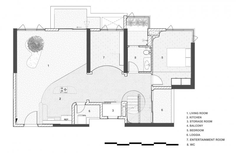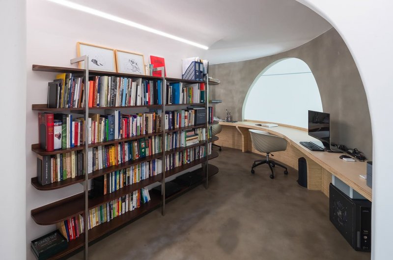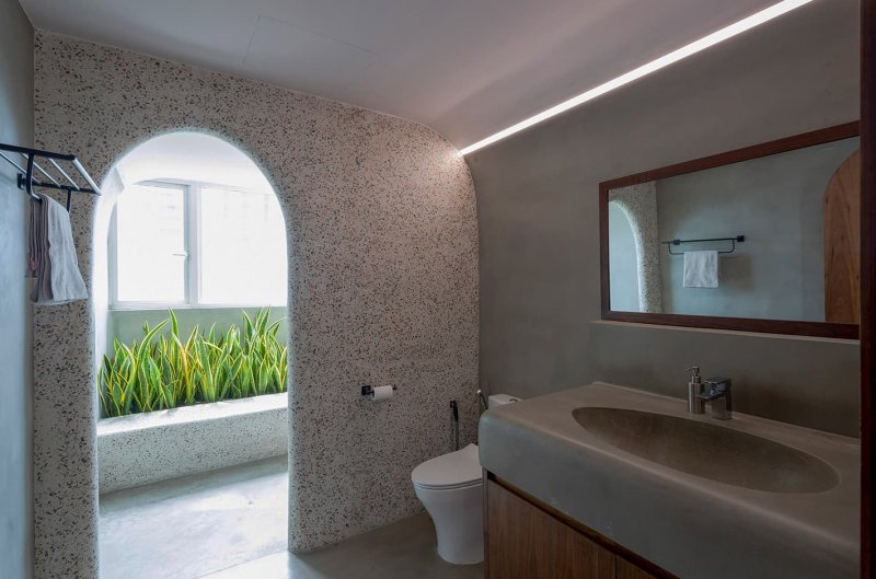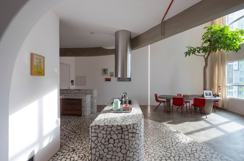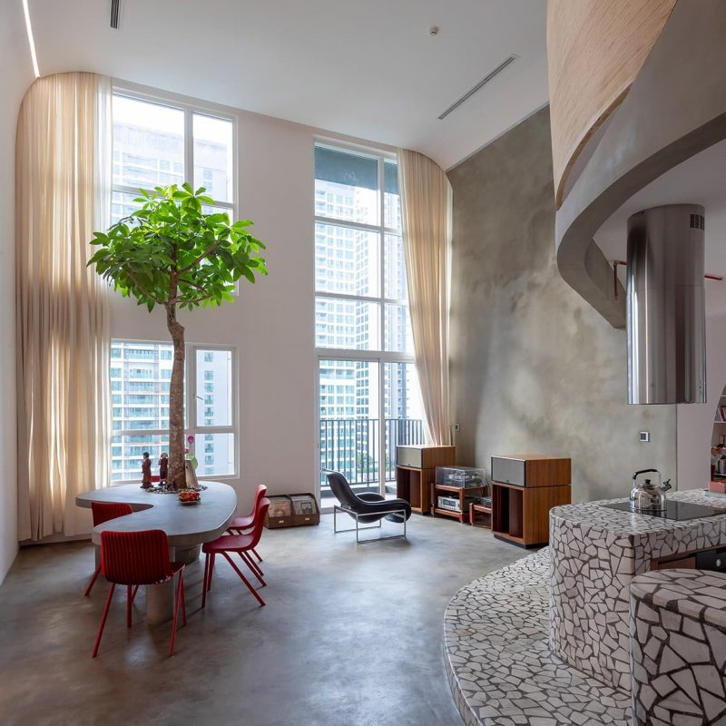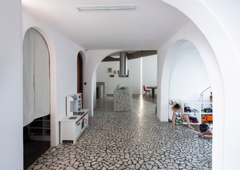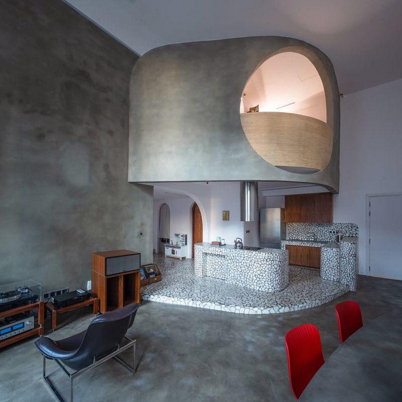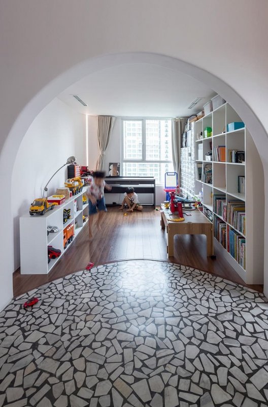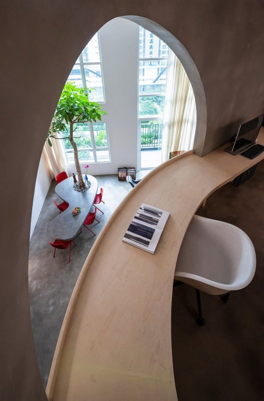 Вносить существенные изменения в планировку было невозможно, поэтому архитекторы сосредоточились на зонировании, рифмующихся формах и умеренной декоративности – связующим элементом для двух этажей стал терраццо из крупных кусков мрамора, который целиком покрывает кухню и «подиум» в гостиной, холл и лестницу на второй этаж. Выбор материала – реверанс в сторону терраццо любимого модернистами и очень модного в Сайгоне 50-60-х годов. В квартире нет острых углов, все проемы арочные, формы – обтекаемые. Основное помещение выполняет роли кухни и гостиной, в которую интегрирована «капсула» с рабочим кабинетом на втором этаже и обзорным окном-«иллюминатором».