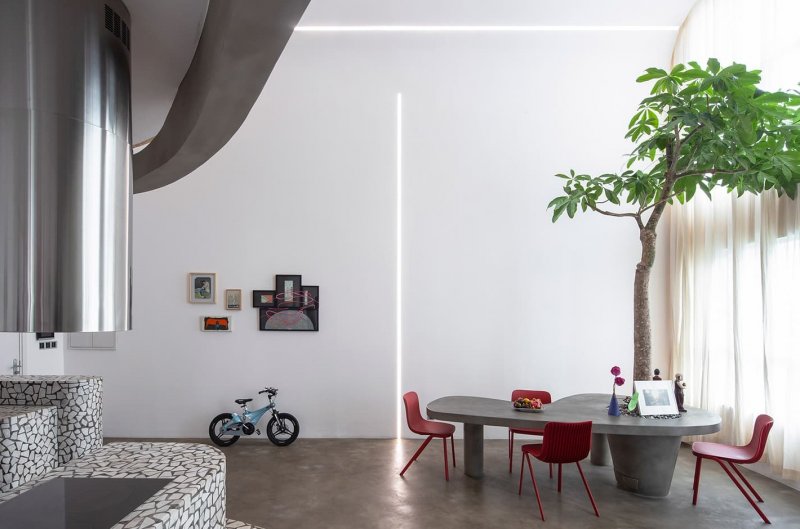 Двухуровневая квартира с терраццо, вдохновленная бетонными объемами американского архитектора Луиса Канна, неожиданно находится во Вьетнаме. Название проекта «Mai» – в переводе с вьетнамского «шлифовать», «полировать» – отсылает к тому, что истинная красота материала проступает после его ремесленной обработки. Работа над шлифовкой поверхностей в проекте длилась целых три года.