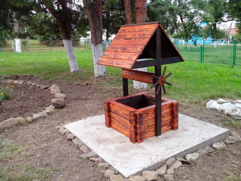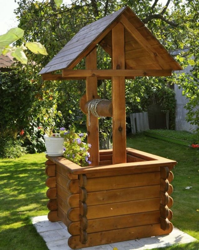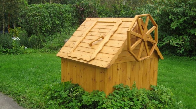 Если домик выполнен из дерева, для украшения можно использовать резные детали. При помощи пропиток и лаков разных оттенков дерево можно сделать солнечно-желтым или затемнить. Часто возле колодцев устанавливают различные деревянные скульптуры.