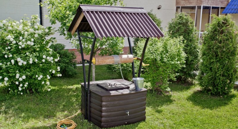 Домик для колодца можно построить из самых разных материалов. Дерево, камень, кирпич или металл – любой из этих и множества других материалов отлично подойдет для данной задачи. Какому из них отдать предпочтение? Дерево выглядит очень привлекательно, но только пока оно новое. Такой домик будет требовать регулярного ухода – ежегодного удаления старой краски и нанесения новой. Если для вас такой вариант не подходит, выбирайте металлическую конструкцию. Из основного материала может быть выполнен только каркас или все строение. На самом деле выбрать оптимальный вариант проще простого. Зачем ломать голову, если можно оформить колодец в том же стиле, что и дом. Благодаря этому строения не будут выглядеть разрозненными, объединятся в единый ансамбль.