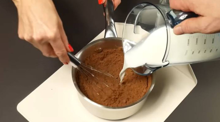 1. Тростниковый сахар смешайте с хорошим какао-порошком и ванилью. Медленно влейте молоко, постоянно помешивая, чтобы не было комочков.