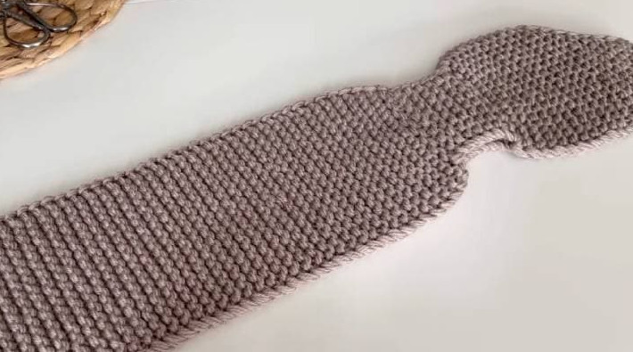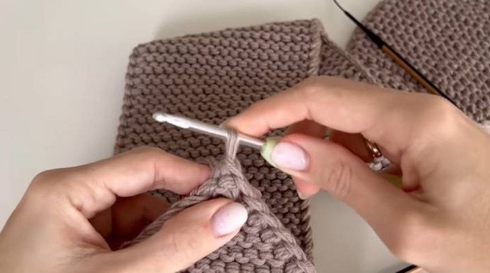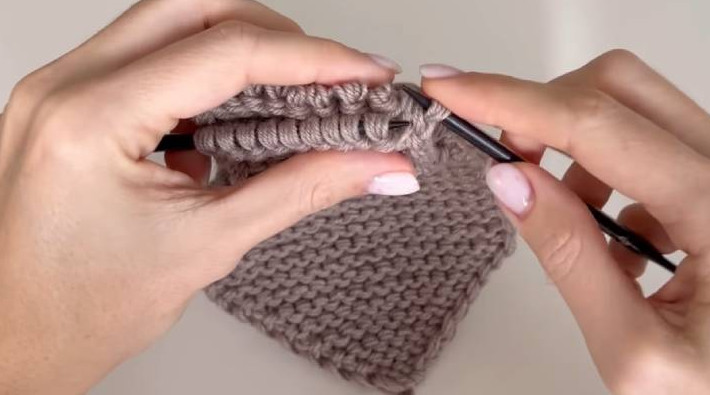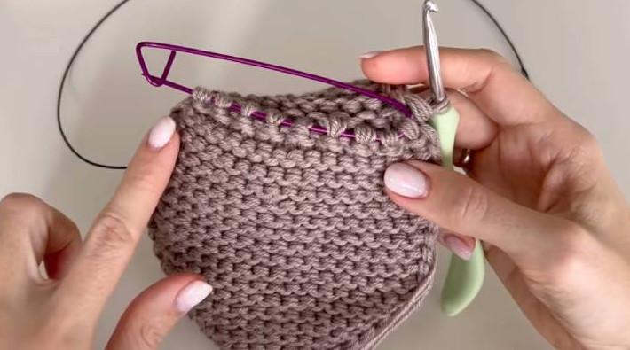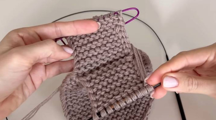 Продолжите вязать так же, только на половине петель. Вязание — лицевые петли за переднюю стенку. Провяжите 8 рядов.
