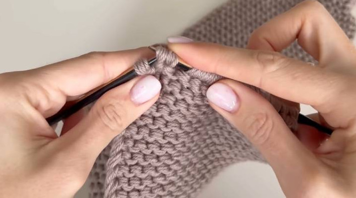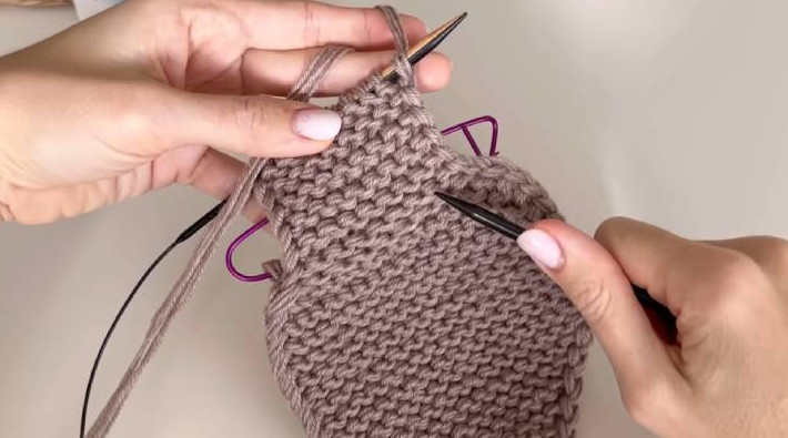 Накиды (добавление) прекратите, когда провязана достаточная ширина полотна. Далее вяжем ещё около 11 рядов одинаково. Первую всегда снимайте, остальные — лицевыми за переднюю стенку, последняя — изнаночной.