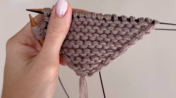 Следующий ряд — первая петля снимается, далее идёт добавление. Его провяжите лицевой за заднюю стенку. Простую петлю — лицевой за переднюю, последнюю — изнаночной. Далее вяжем аналогичным образом: добавление только в начале и в конце + все петли лицевыми. Чётный ряд снова вяжется лицевыми то за переднюю, то за заднюю стенку (там, где был накид). Таким образом, провяжите, пока на спицах не окажется 19 петель. Однако ширина полотна может быть и больше, по вашему желанию.
