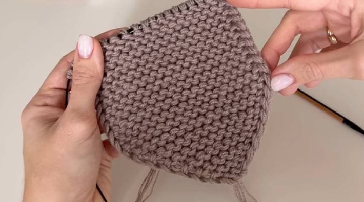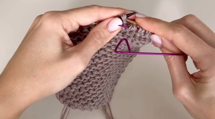Теперь необходимо начать делать убавки. Первую всегда снимайте, а две следующие провяжите лицевой, как одну. Потом до конца ряда вяжите как обычно. Когда останется 3 петли, 2 из них провяжите вместе лицевой, а последнюю — изнаночной. Делайте такие убавки через ряд. Вяжите так, пока на спице не окажется снова 3 петли.
