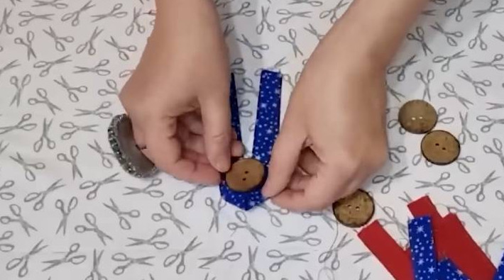 Для второй идеи подготовьте полотенце 33*70 см. Также разрежьте его на две равные части. Ещё понадобятся полоски ткани — 5*25 см, по 3 шт. на каждую половинку полотенца.