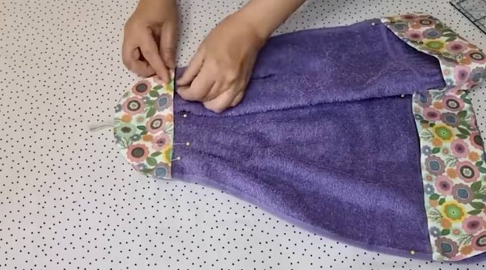 Из той же ткани и флизелина вырежьте длинную полосу. Пришейте её к полотенцу снизу.