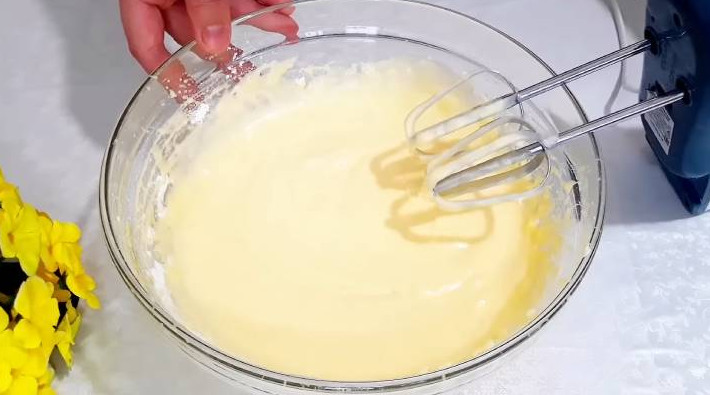 Мягкое сливочное масло взбейте венчиком добела в течение 5 минут. После этого добавьте майонез, сахарную пудру, яйца, ванилин и соль. Взбейте ещё раз до однородности ингредиентов. Масса должна получиться пышная.