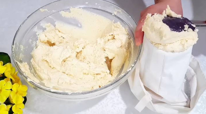Просейте муку с разрыхлителем, замесите воздушное тесто. Для удобства формирования печенья переложите его в кондитерский мешок.