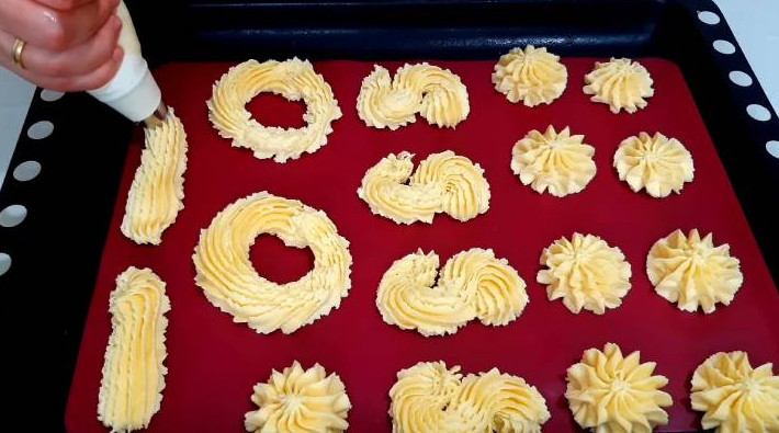 Выдавите печенья на форму с силиконовым ковриком или пергаментом. Дополнительно смазывать маслом нет необходимости.