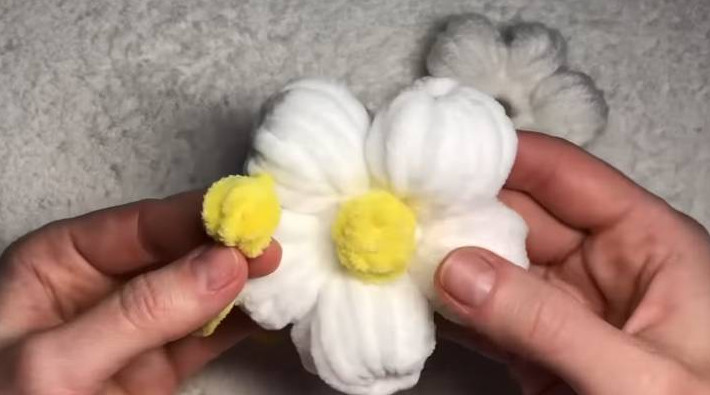 На фото ниже, для наглядности, показано, что для более пышных лепестков потребуется набрать больше пышных столбиков (в том числе — и для центра цветка). Вставьте серединку в отверстие.