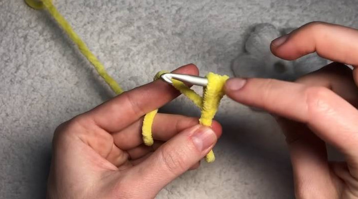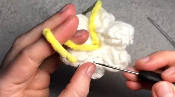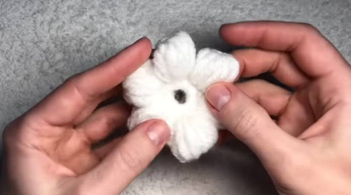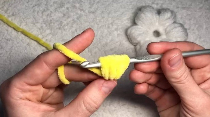 Сделайте таких протяжек с накидом столько раз, сколько необходимо, чтобы получилась пышная серединка для вашего цветочка. В данном МК мастерица провязывала по 3 раза, так как её пряжа толстая.