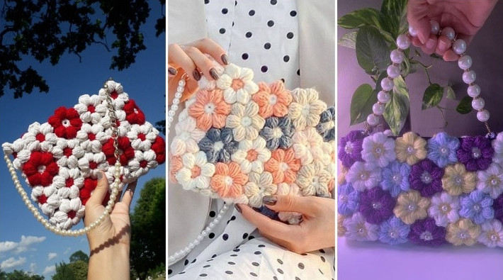 Также цветы, вязанные крючком — это шикарная идея для сумочки! Ручку можно купить готовую (фурнитура для сумки) или собрать самостоятельно из бусин. Ещё один вариант — ручку сумки можно также связать из пряжи. Не забудьте отдельно сшить чехол внутрь такой сумочки.