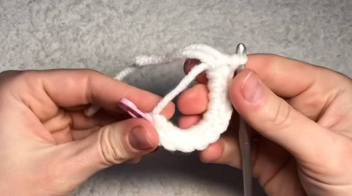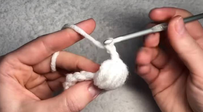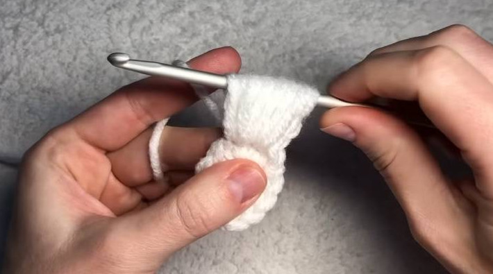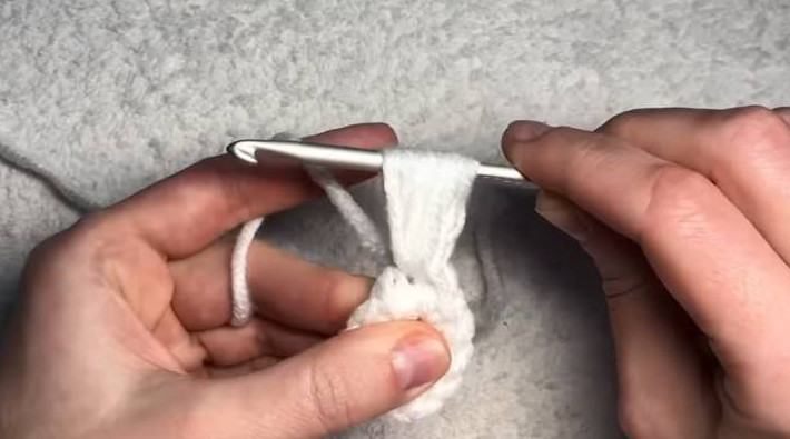 Снова накид, но теперь крючок вставьте в следующую, вторую петлю в ряду. Вновь вытяните рабочую нить. Вновь повторите так 3 раза. Теперь провяжите все петли на крючке вместе, замкните.