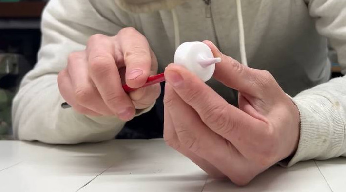 Возьмите пластиковую бутылку любого объёма. Открутите крышку. Нагрейте её с лицевой стороны. Теперь возьмите деревянную шпажку, или спицу, или палочку для суши. В мягком пластике сделайте длинный носик.