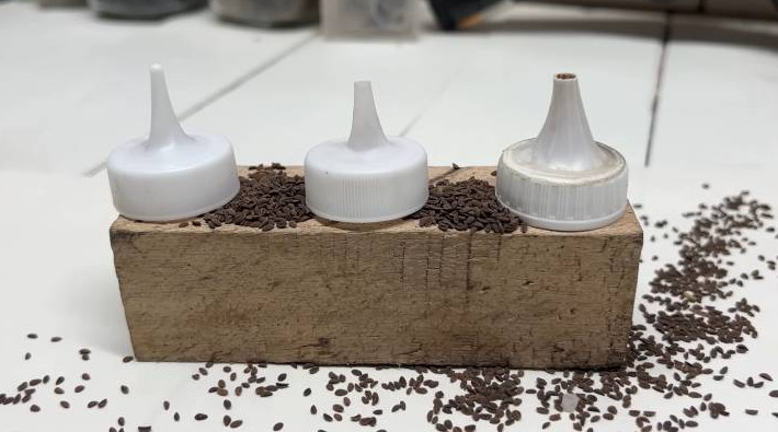 Проверить, как работает сеялка, просто. Насыпьте в бутылку семена, закрутите крышку с носиком. Положите согнутый лист бумаги. Переверните бутылку вверх дном и потрясите. Если семена выходят ровной строчкой и не слишком быстро, то всё сделано правильно!