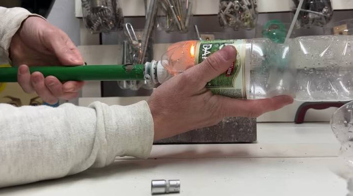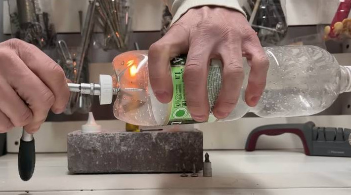 Однако нужно усовершенствовать сеялку, чтобы не пришлось наклоняться во время работы. Для этого возьмите вторую бутылку, открутите у неё крышку. В дне первой бутылки сделайте отверстие горячим гвоздём. Вставьте саморез в крышку и закрутите.