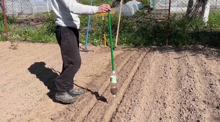 Открутите крышку, насыпьте семена. Верните крышку на место. Переверните бутылку, держась за черенок. Заранее подготовьте углубления в земле. Теперь просто, не нагибаясь, пройдитесь вдоль лунки и посейте семена. Для этого бутылку нужно немного трясти.