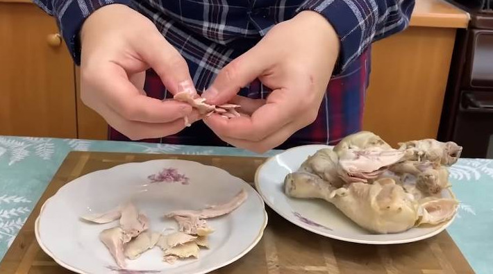 Возьмите 3 л воды и сварите любую часть курицы на своё усмотрение. Затем отделите мясо от кости и кожи.