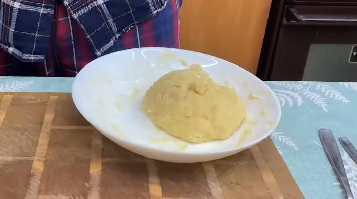Смешайте яйца, соль, масло и воду. Потихоньку всыпьте муку, замесите мягкое тесто. Прикройте плёнкой, пока готовите начинку.