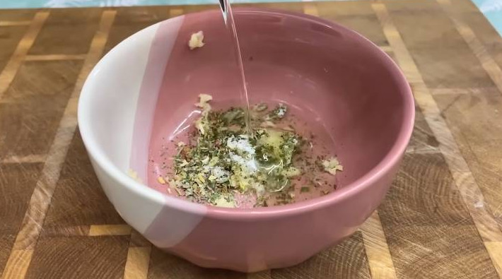 Пропустите чеснок через пресс. Добавьте растительное масло, соль и обязательно прованские травы (или итальянские специи). Перемешайте — начинка готова!