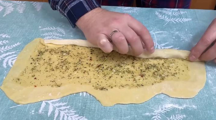 Раскатайте тесто в пласт. Распределите начинку, не доходя до краёв. Заверните рулет, защипните края.