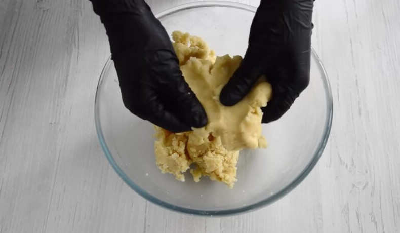 Добавьте к бисквитной крошке столовую ложку творожного сыра, маскарпоне или мягкого творога. Необходимо получить упругую массу, из которой будет удобно формовать пирожные.