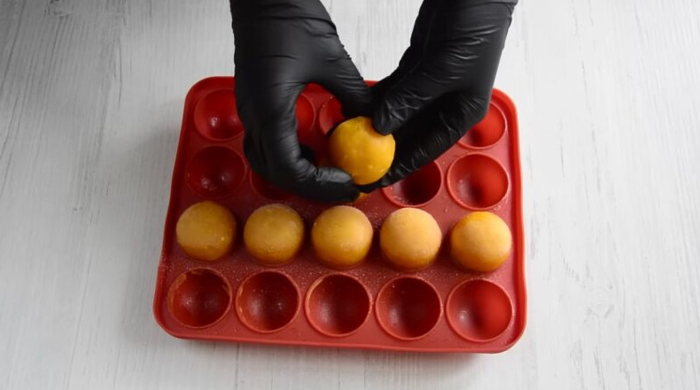 Замерзшие полусферы слегка прогрейте феном и соедините попарно, чтобы получить круглую заготовку. Еще раз заморозьте круглые заготовки.